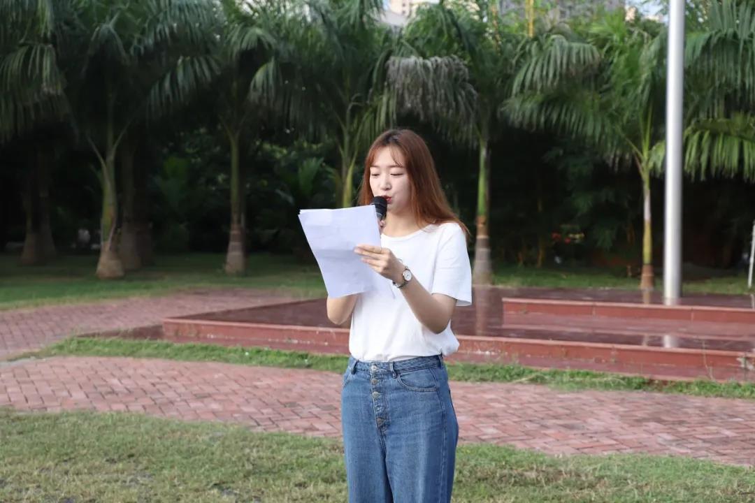 仪式第四项,由学生代表张菲菲进行国旗下的讲话,祝贺中华人民共和国成立七十一周年,同时向全体师生致以节日的问候。她回顾了2020年全国各族人民团结抗疫的艰辛历程,号召同学们学会珍惜,谨记习近平总书记的教导,不负青春,以实际行动为中华民族伟大复兴添砖加瓦。