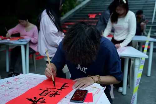 阵阵墨香指尖流,幽幽韵味心脾沁。活动现场,春联纸、毛笔和砚台被整齐地摆放在桌子上,鲜红的纸张渲染着浓浓的节日氛围。一笔一墨、一横一竖、一撇一捺…一幅幅写满新春祝福的春联和“福”字在红色纸间绽开,写的是汉字,报的是节讯,暖的是人心。
