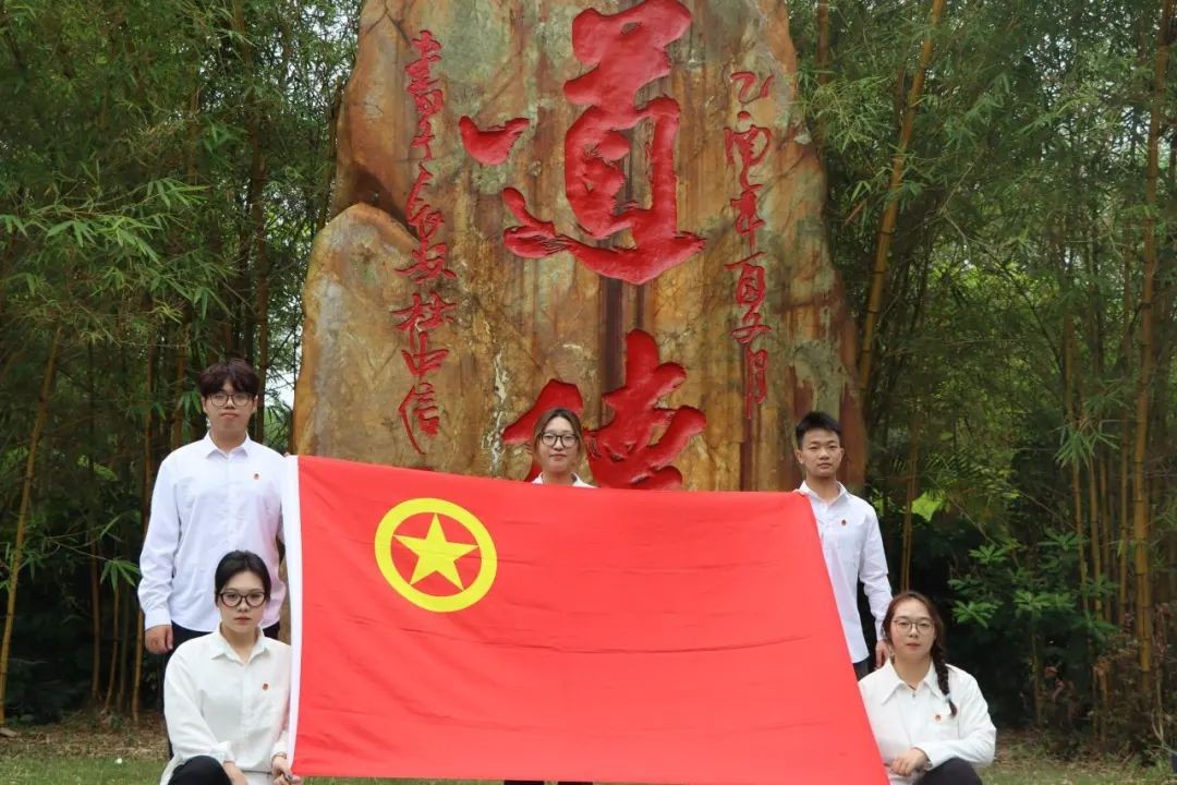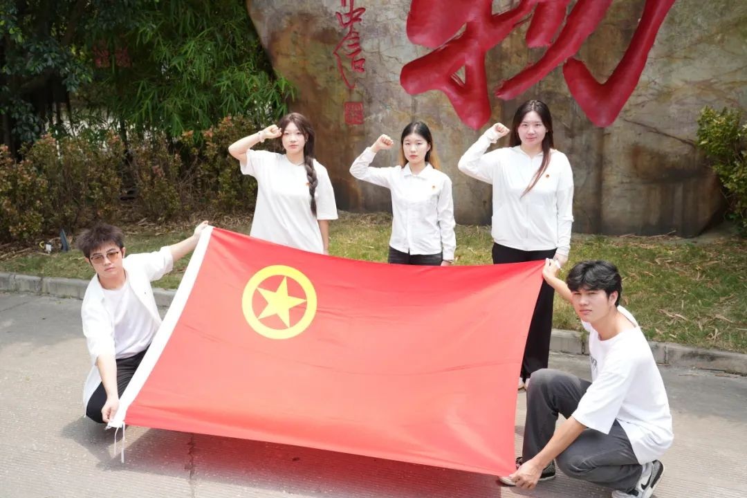 青春正好,共同奋进,百年传承,不负盛世,高举团旗,紧跟党走,与团旗合影,展现青春风采。